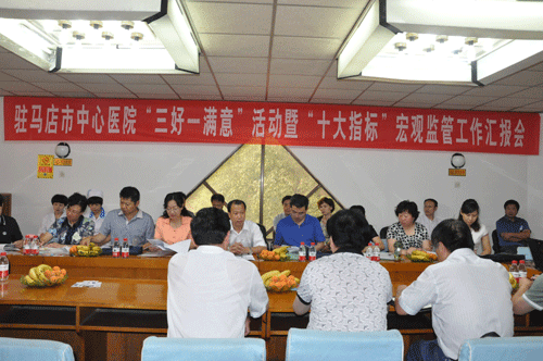 市卫生局医政科胡军衔科长、院领导班子成员和相关科室负责人参加了汇报会。陈建华院长代表全院职工对专家们的到来表示热烈的欢迎和由衷的感谢,就我院“三好一满意”暨“十大指标”宏观监管的实施和落实情况进行了详细汇报。
