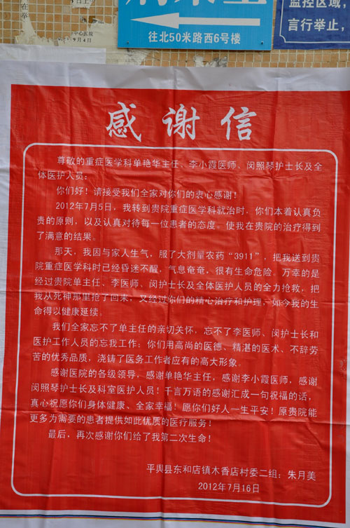 那天,我因与家人生气,服了大剂量农药“3911“,把我送到贵院重症医学科时已经昏迷不醒,气息奄奄,很有生命危险。万幸的是经过贵院单主任、李医生、闵护士长及全体医护人员的全力抢救,把我从死神那里抢了回来,又经过你们的精心治疗与护理,如今我的生命得以健康延续。