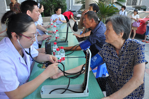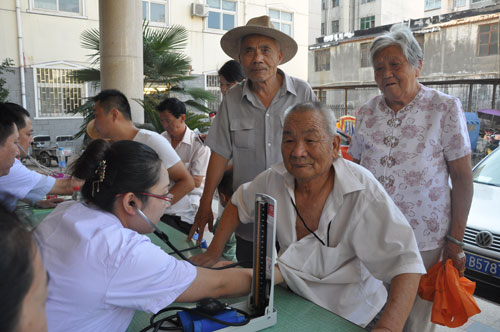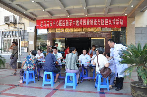 7月10日,驻马店市中心医院的医学专家来到驿城区西园电力社区卫生服务中心,开展“脑卒中危险因素筛查与防控义诊” 活动,为市民测量血压、血脂等,对被检查者脑卒中的危险程度进行评估并提供健康指导。