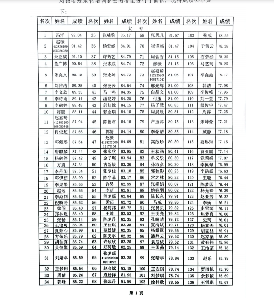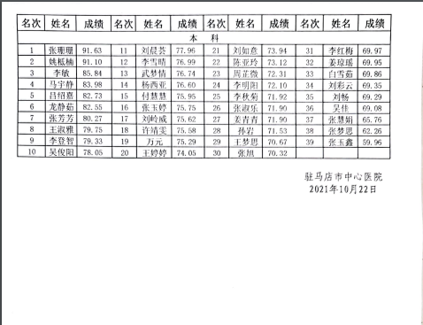 根据《驻马店市中心医院2021年招收规范化培训护士面试通知》安排,驻马店市中心医院于2021年10月21日对报名规范化培训护士的考生进行了面试,现将成绩公示如下: