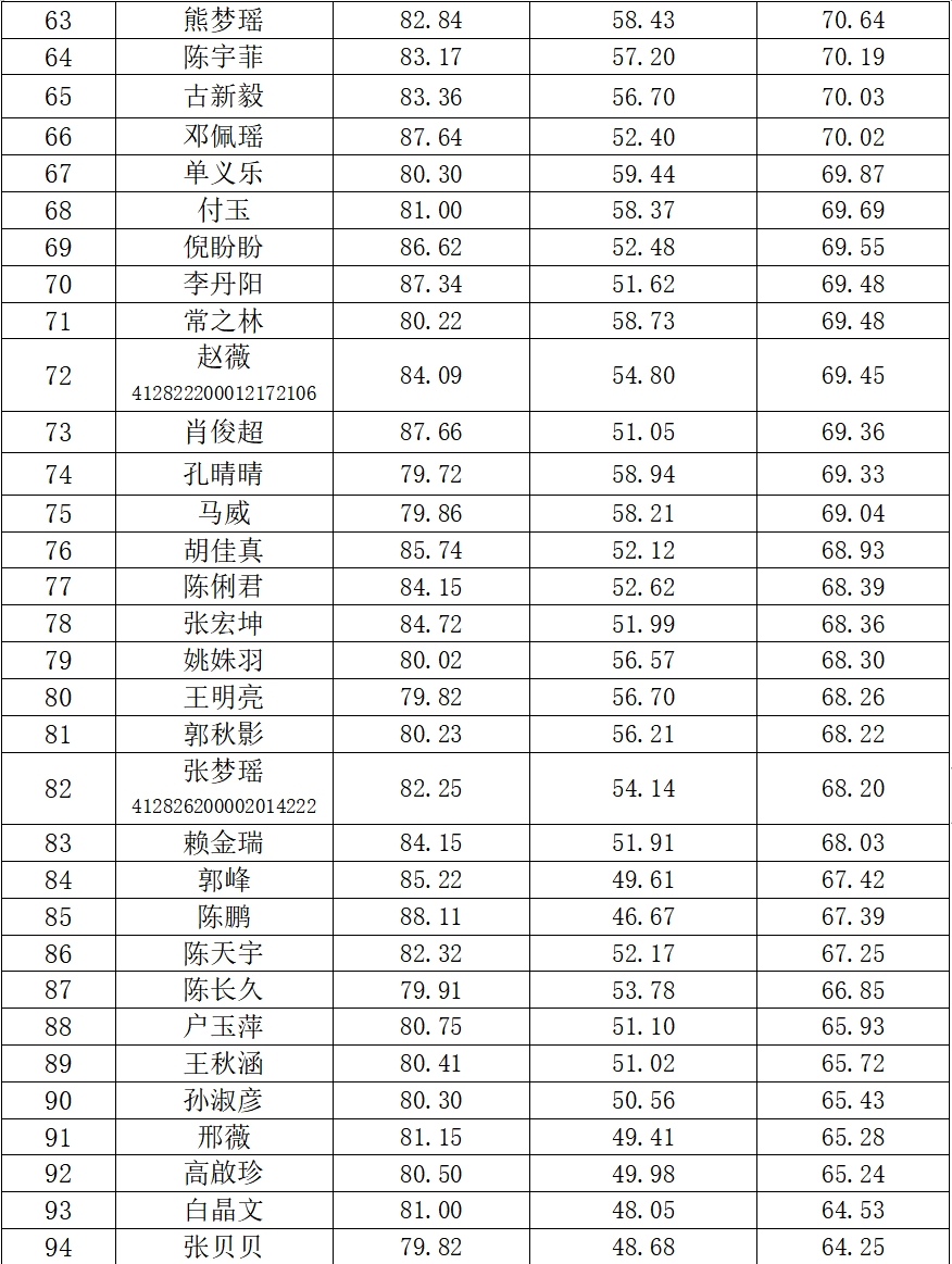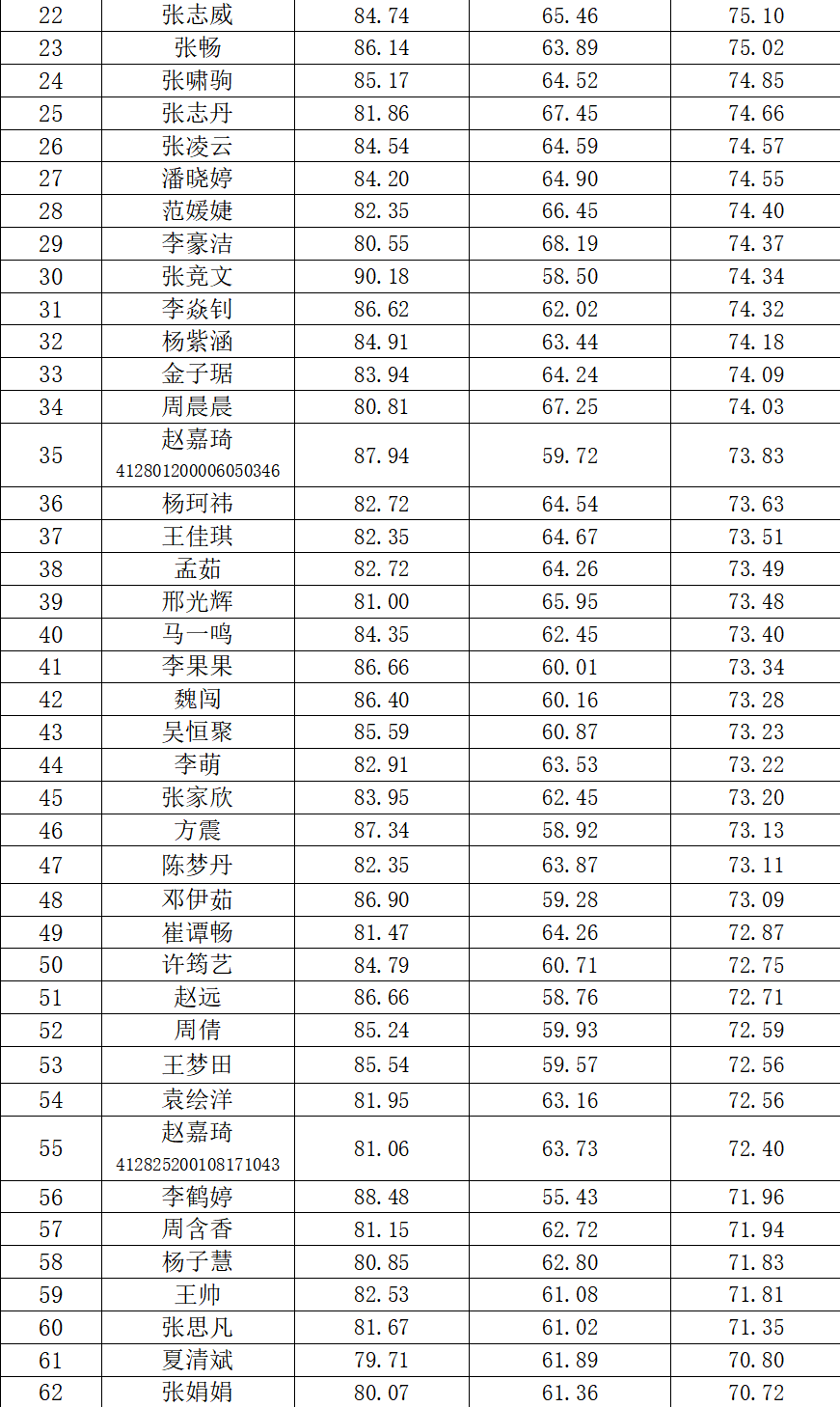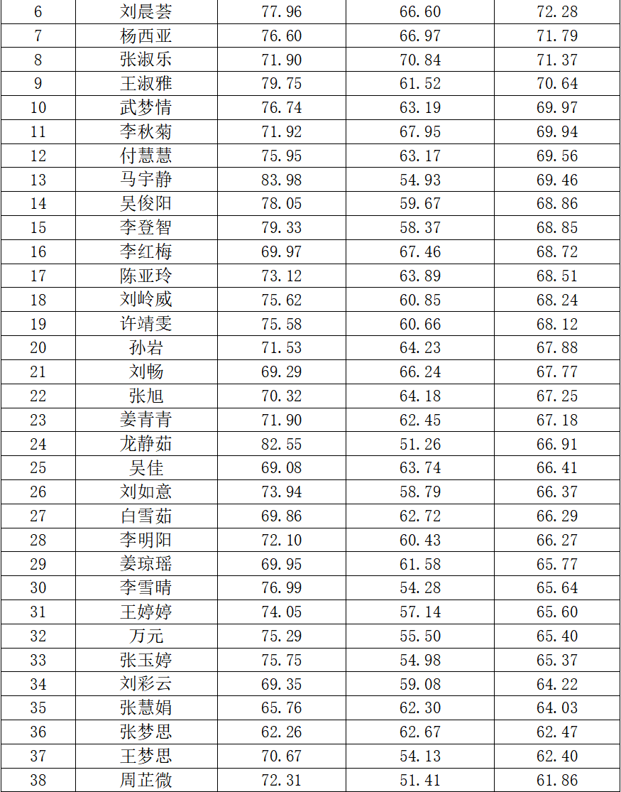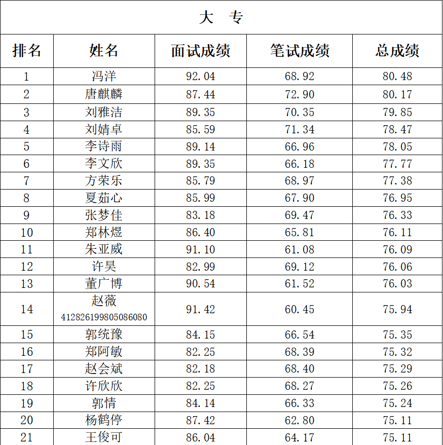根据《驻马店市中心医院2021年招收100名规范化培训护士公告》,驻马店市中心医院于2021年10月21日、11月2日对报名规范化培训护士的考生进行了面试和笔试工作,按照总成绩=面试成绩*50%+笔试成绩*50%的原则,现将总成绩汇总如下: