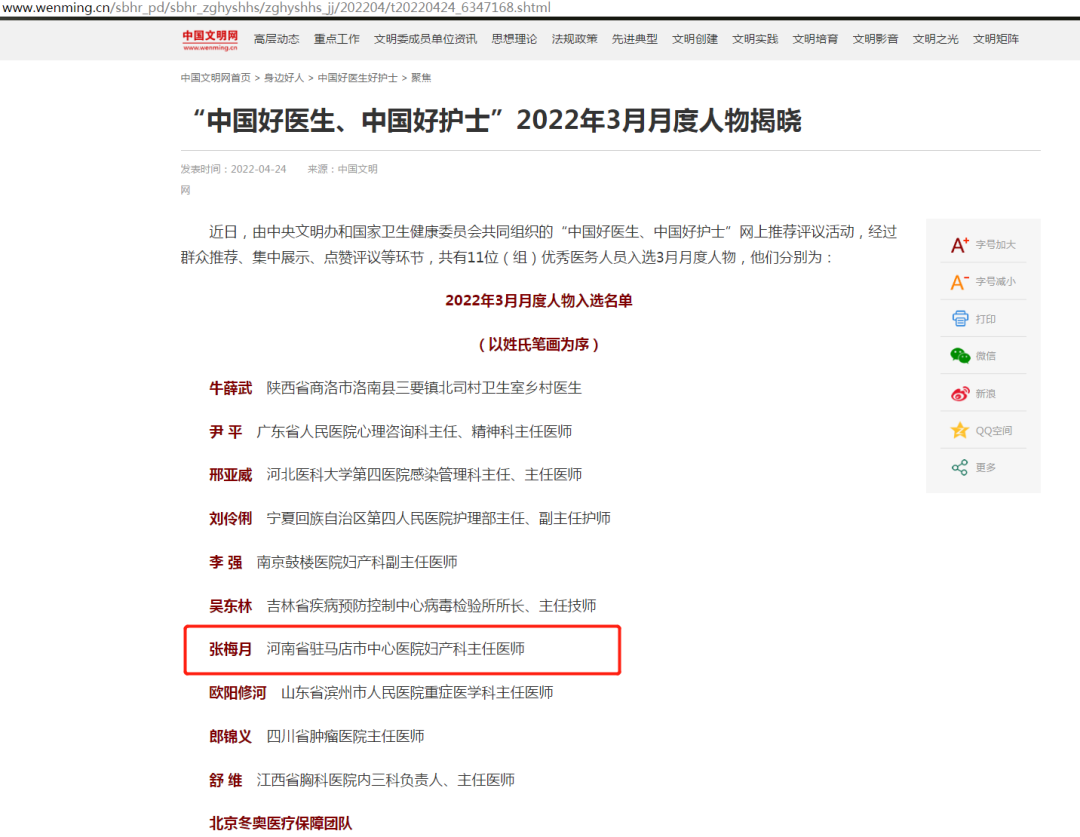 近日,在中央文明办和国家卫生健康委员会共同组织的“中国好医生、中国好护士”网上推荐评议活动中,河南省驻马店市中心医院妇产科主任医师张梅月经过群众推荐、集中展示、点赞评议等环节,荣获3月中国好医生称号。据悉,此次全国共有11位(组)优秀医务人员入选。