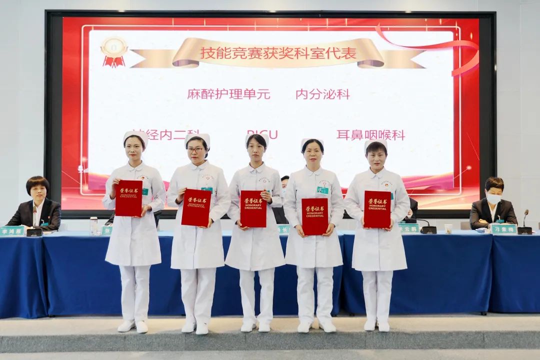 与会领导为医院“优秀护士”代表、“优质护理服务”先进科室、多站式护理技能竞赛获奖个人及集体代表进行了颁奖。