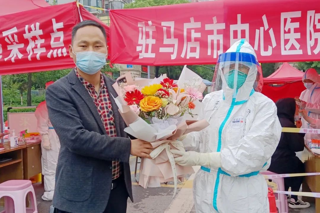 “真的太感谢魏娇护士了,要不是她上门给我父亲做检测,我们全家还不知道怎么办呢。”5月10日上午,市开源大道西段明珠港湾小区门口出现了温馨一幕,市民王先生拿着一束鲜花献给了正在这里为居民做核酸检测的护士魏娇,并不停地向魏娇表示感谢。