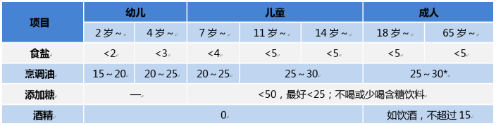 表1 不同人群食盐、烹调油、添加糖的推荐摄入量和酒精的控制摄入量