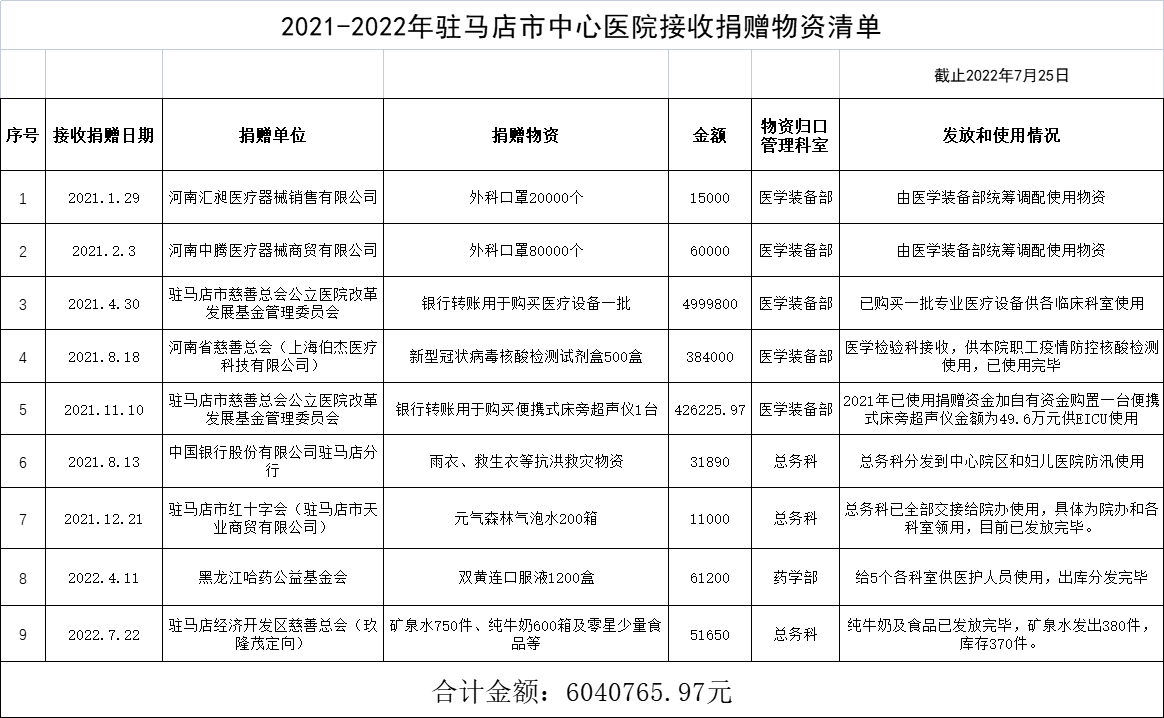 2021-2022年驻马店市中心医院接收捐赠物资清单