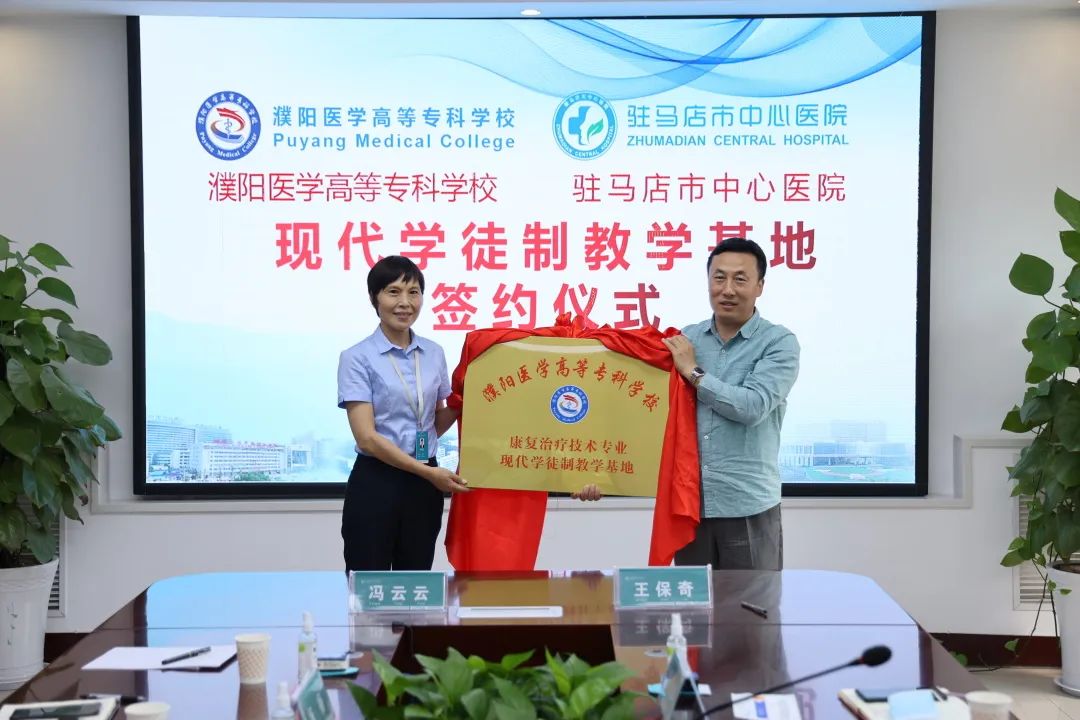 濮阳医学高等专科学校为驻马店市中心医院授《濮阳医学高等专科学校康复治疗技术专业现代学徒制教学基地》牌匾。