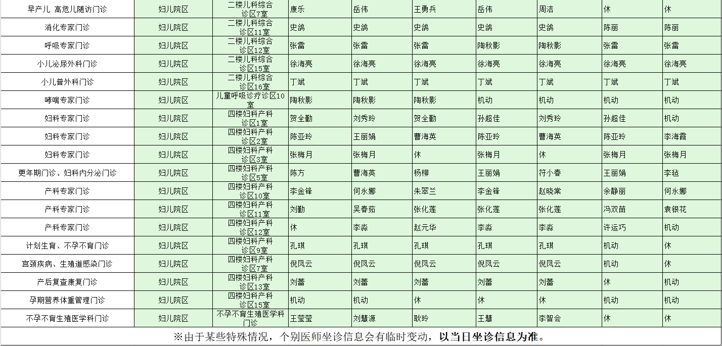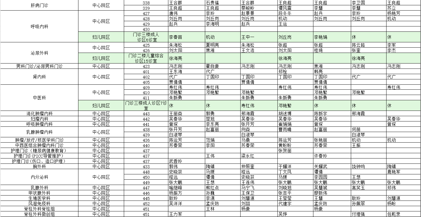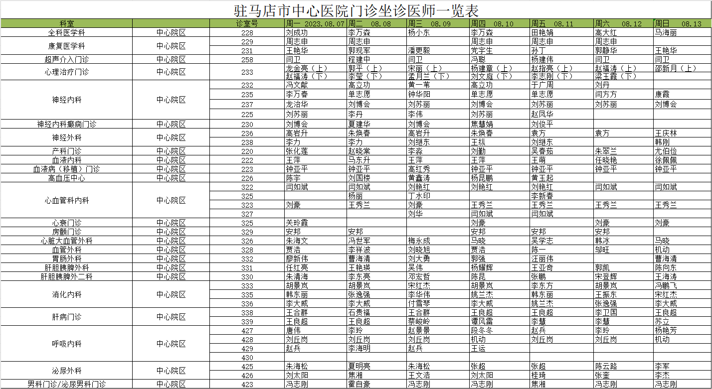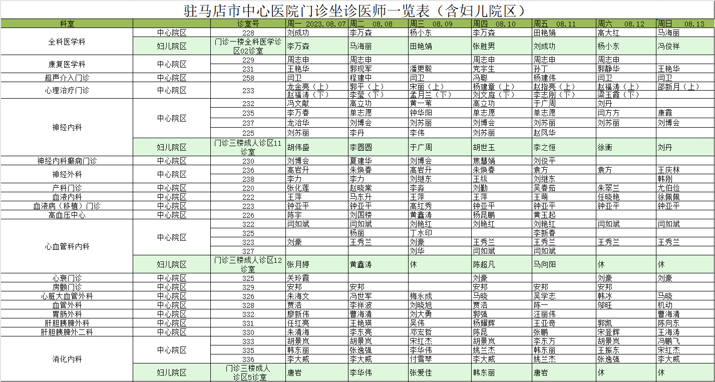驻马店市中心医院门诊坐诊信息一览表(含妇儿院区)