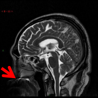 但是如有可拆卸的假牙或者金属牙箍,建议MRI检查时取下,不然影像可能会和下面图像一样,黑乎乎的一片,什么都看不见,这种情况就要影响诊断了。