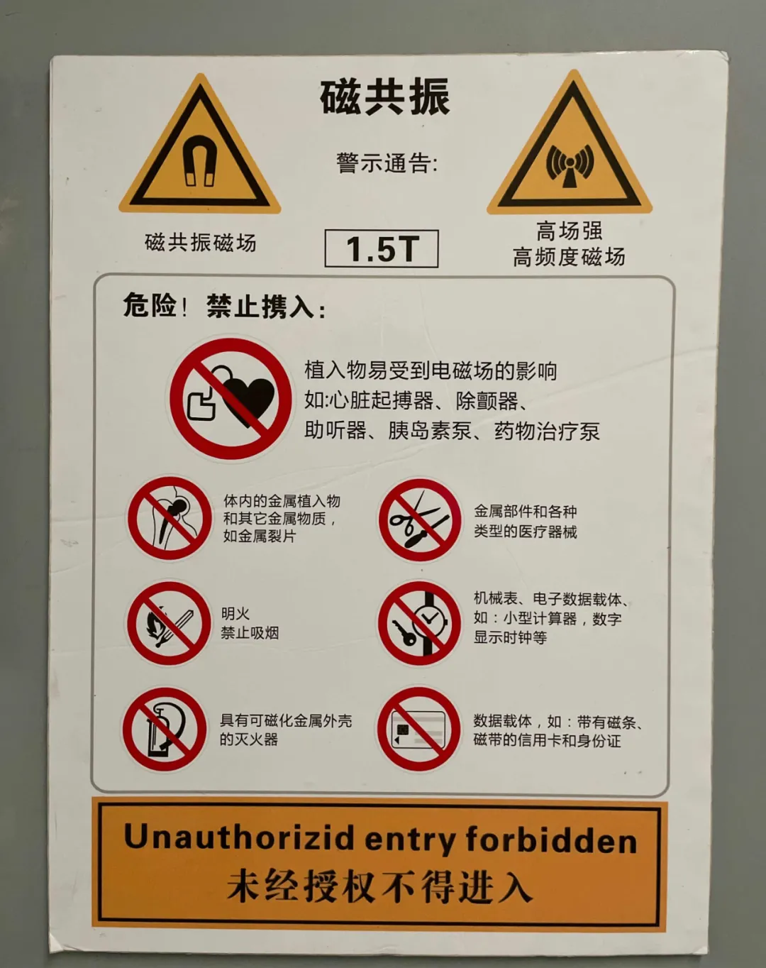 不得佩戴金属物品进入磁体间。在磁共振检查室门口经常可以看到类似这样的警示牌。磁共振检查前,放射技师会询问患者体内外是否有金属物品。体外金属异物问题容易解决,但是有些体内的金属植入物,比如手术后植入人体的血管支架、心脏起搏器、骨科内固定、牙科植入物等等,到底哪些能做磁共振检查,哪些不能做检查?