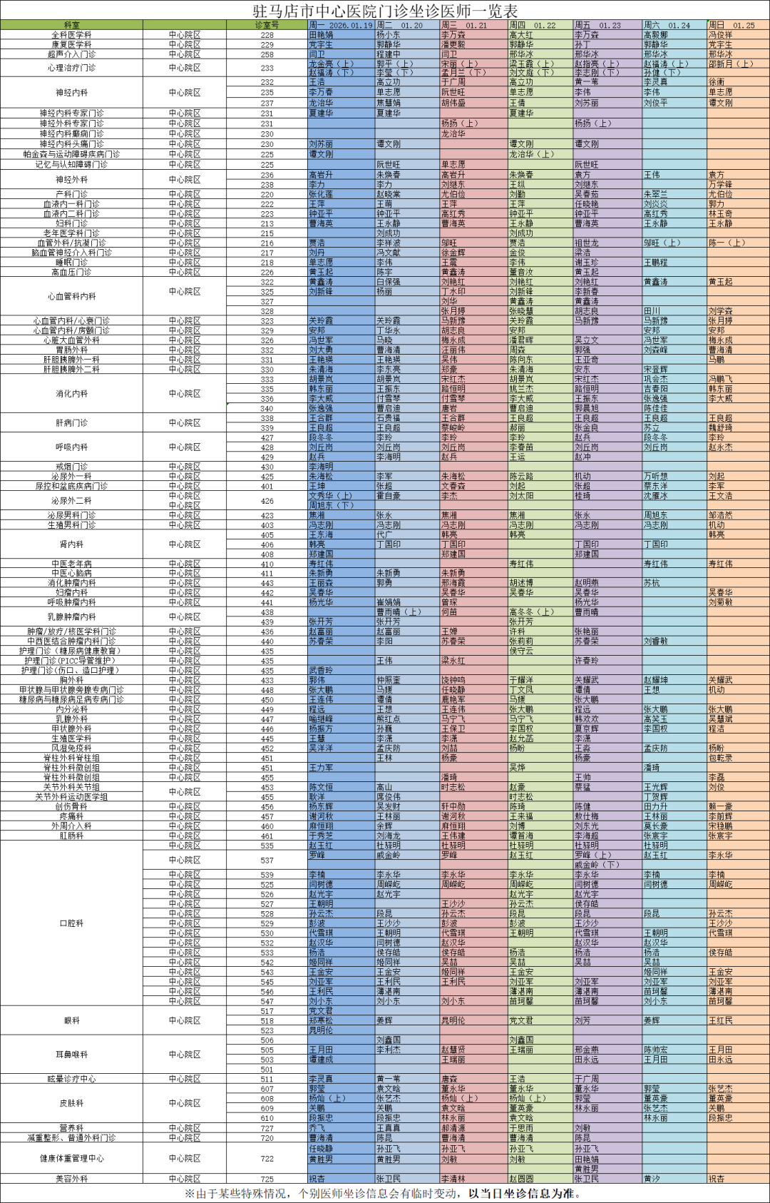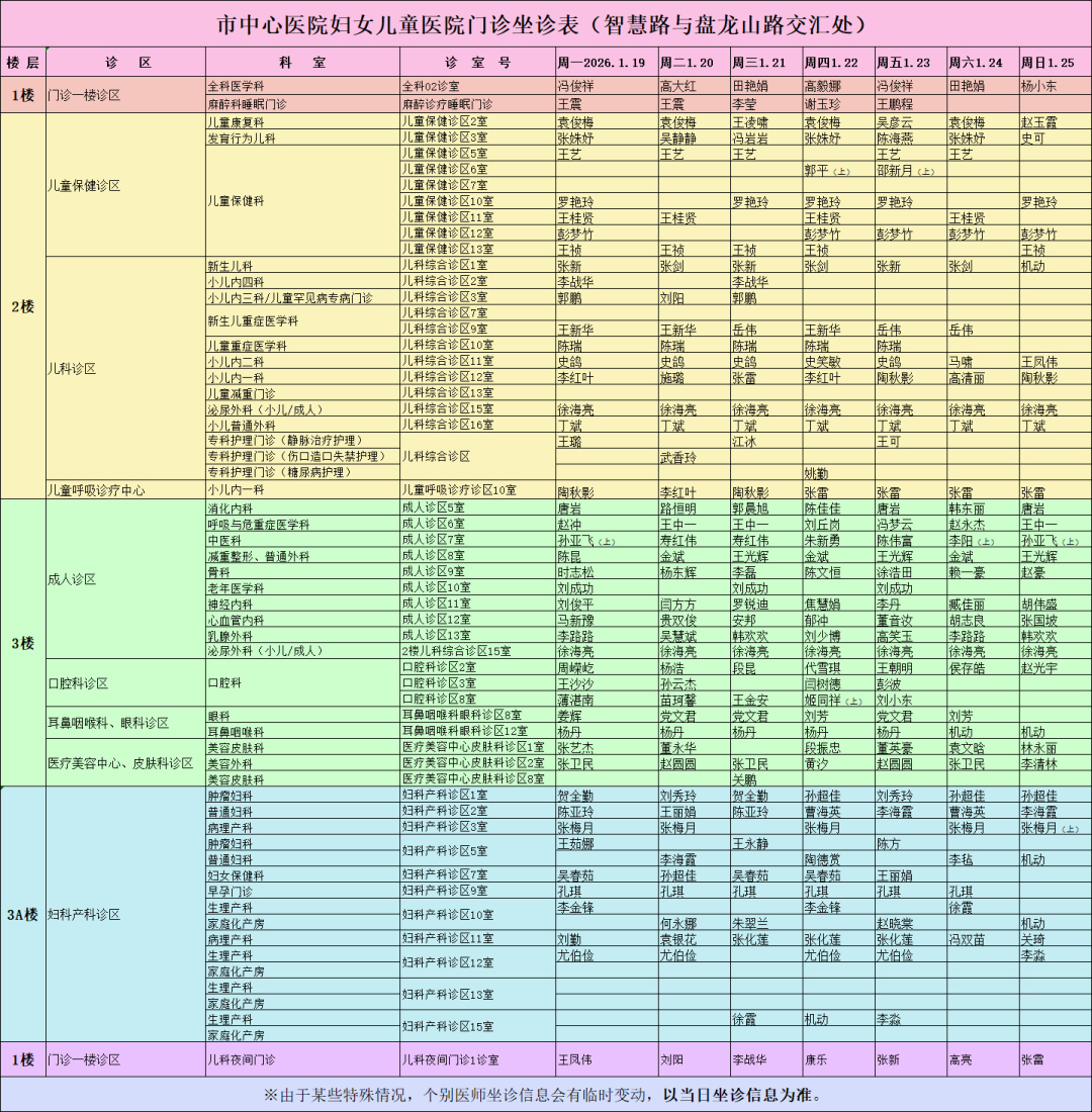 市中心医院(含妇女儿童医院)门诊坐诊表(1月19日-1月25日)