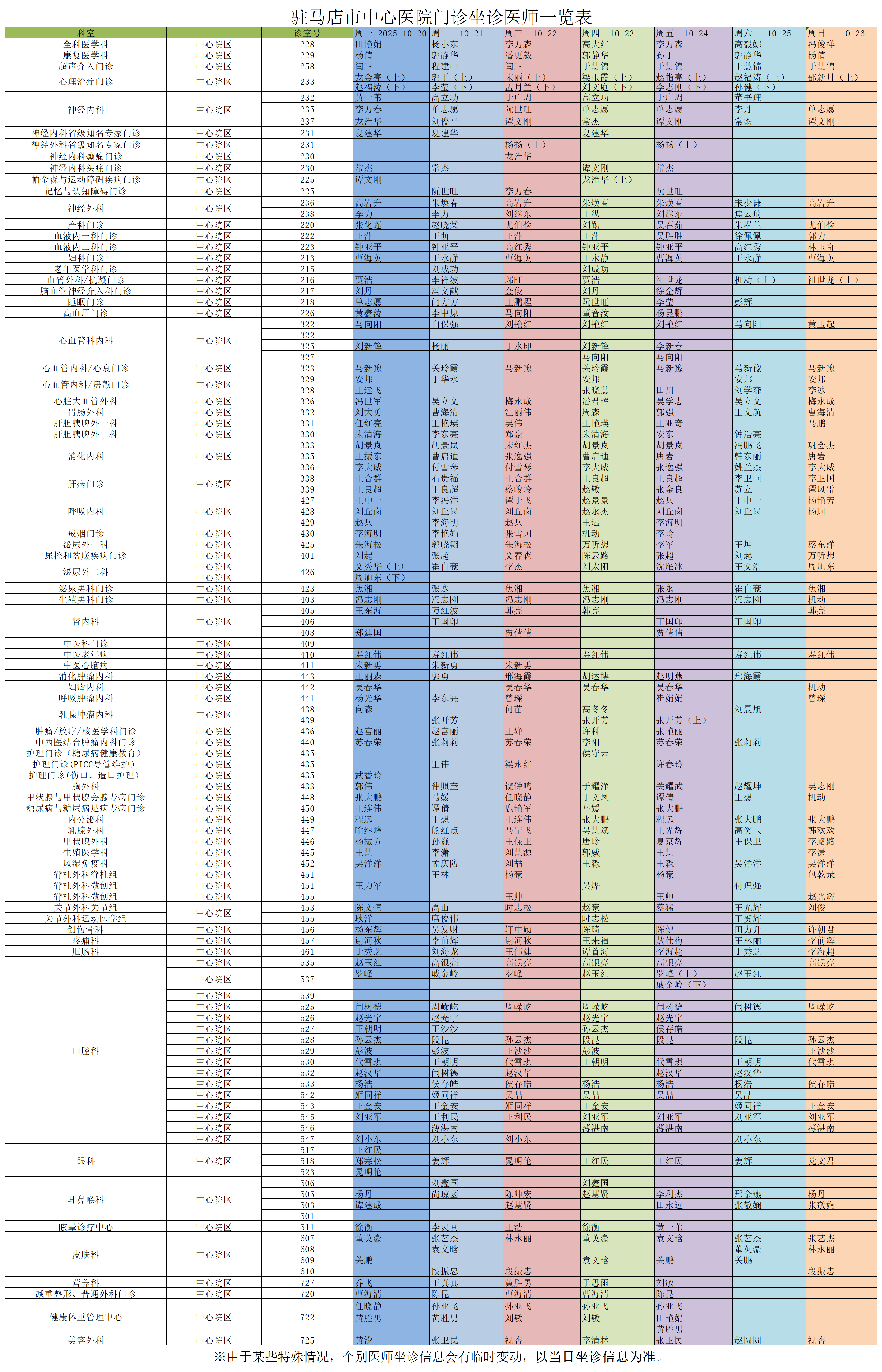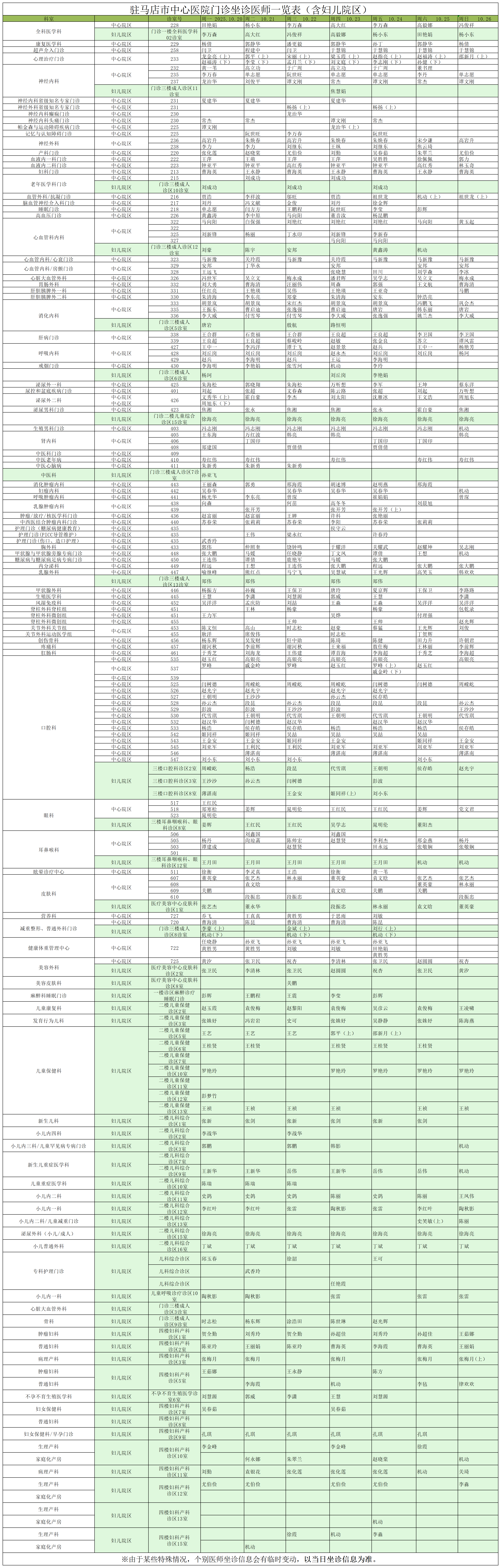 驻马店市中心医院门诊坐诊信息一览表(含妇儿院区)