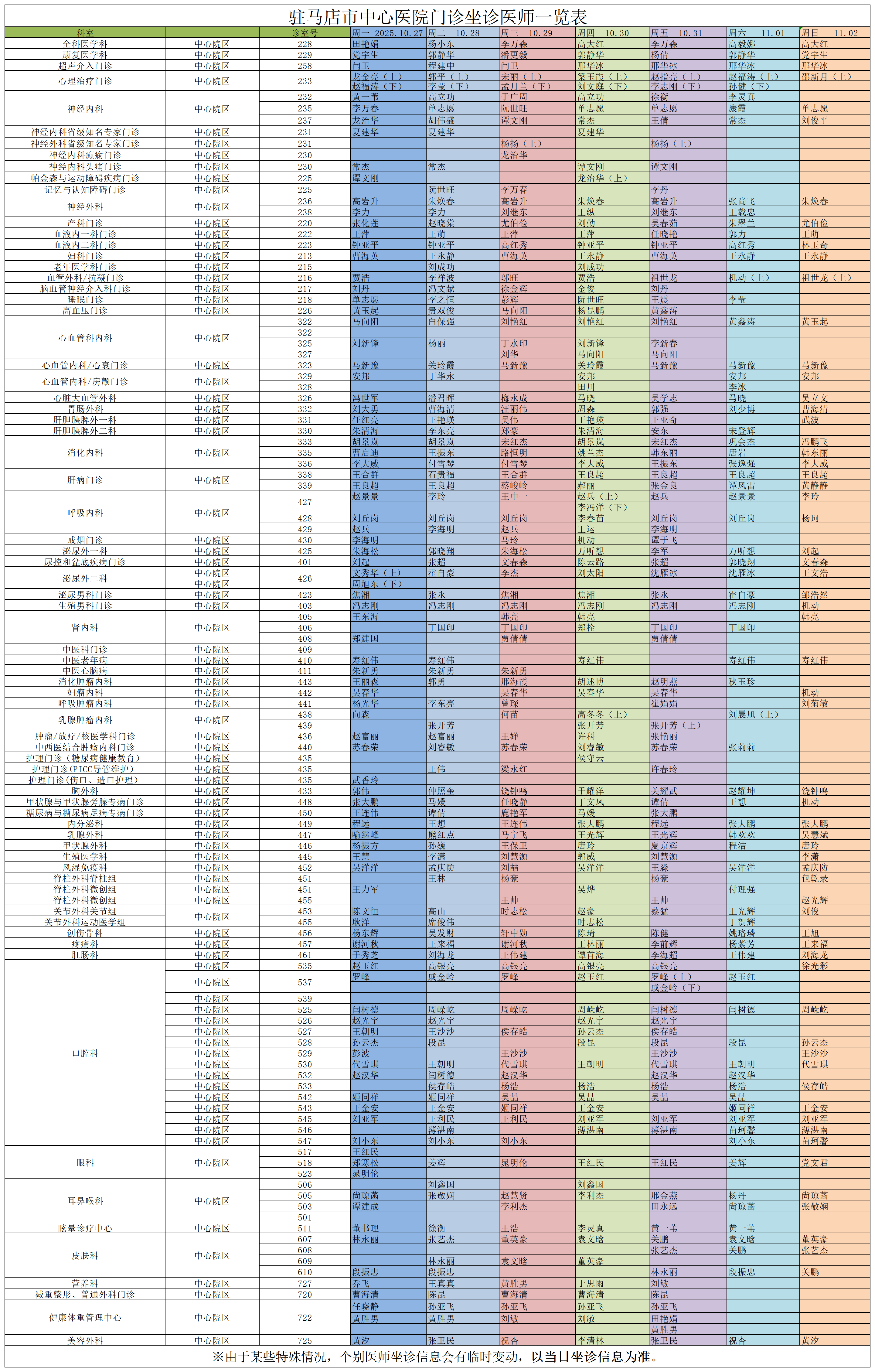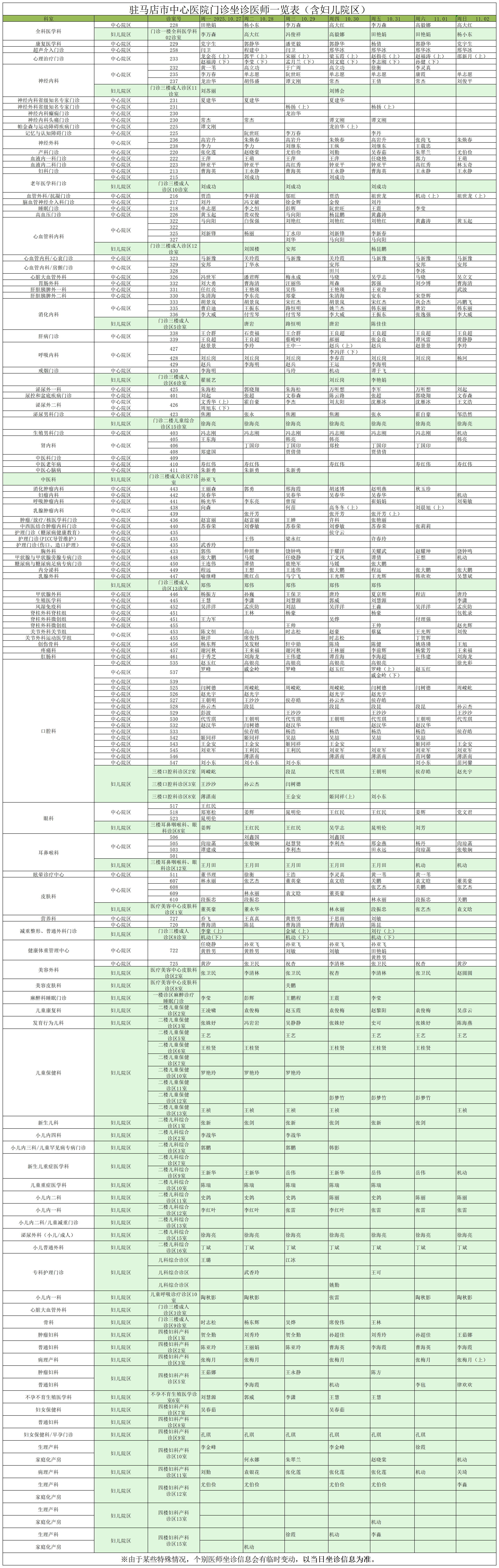 驻马店市中心医院门诊坐诊信息一览表(含妇儿院区)