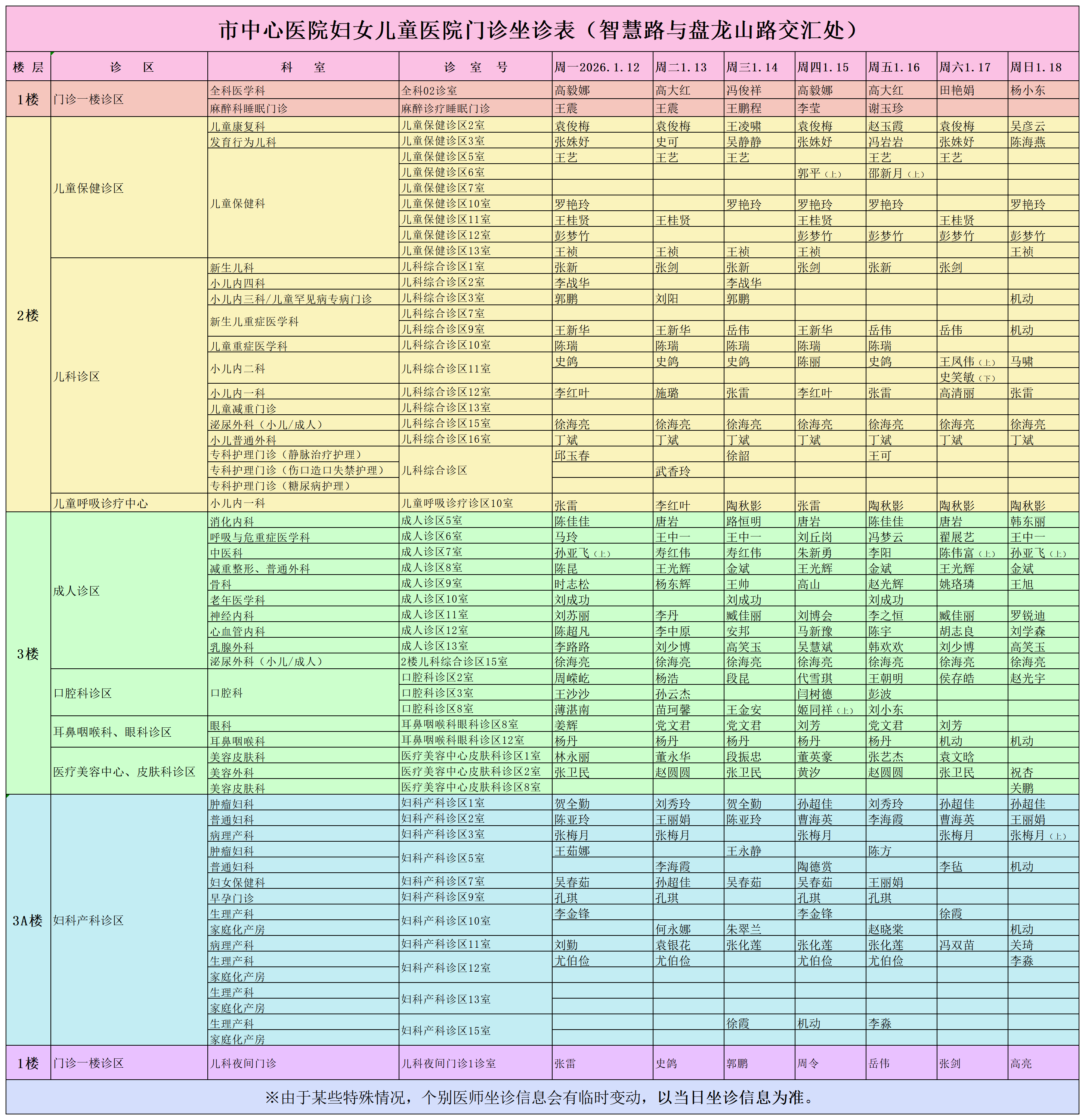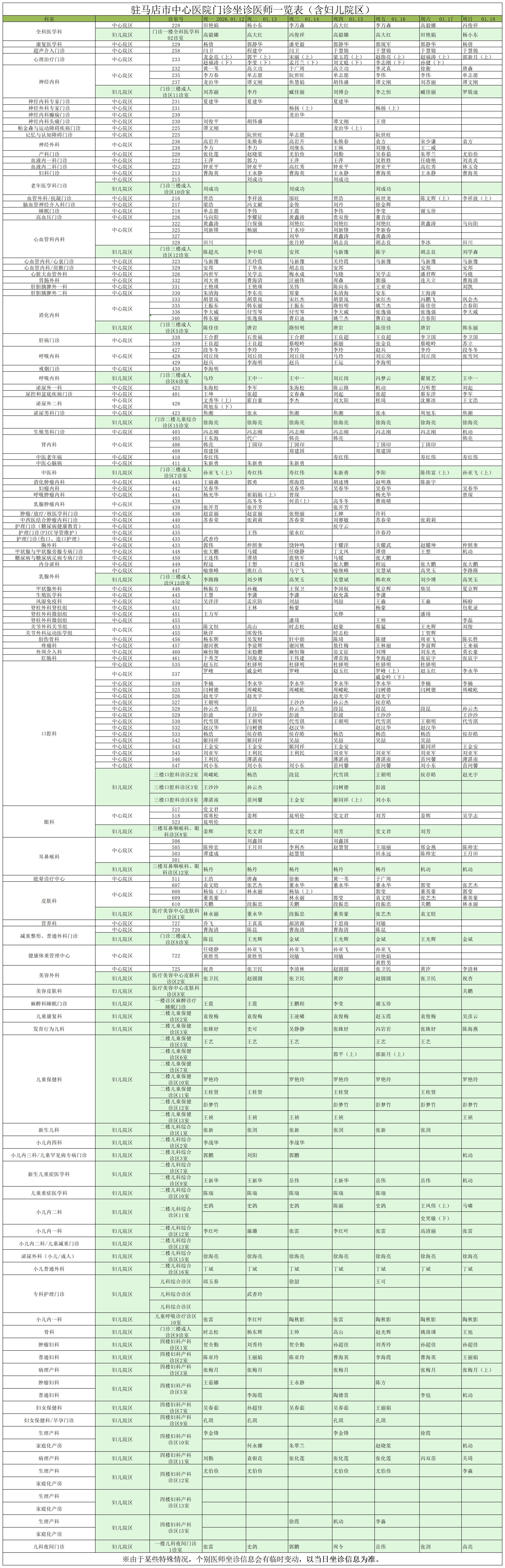 驻马店市中心医院门诊坐诊信息一览表(含妇儿院区)