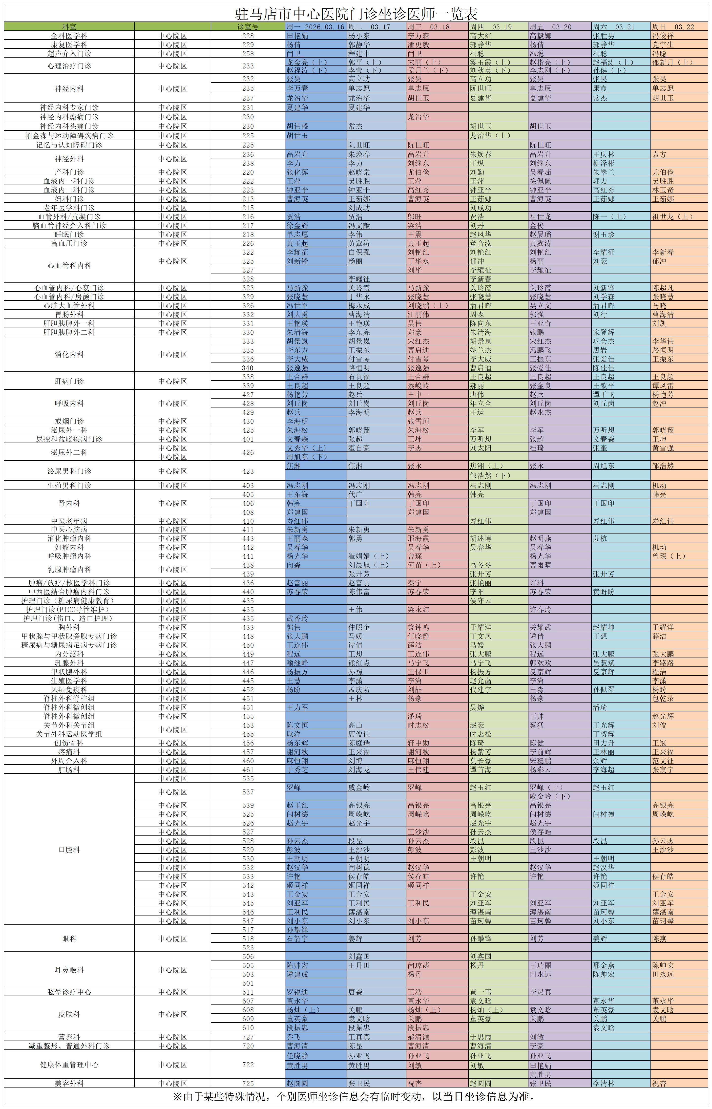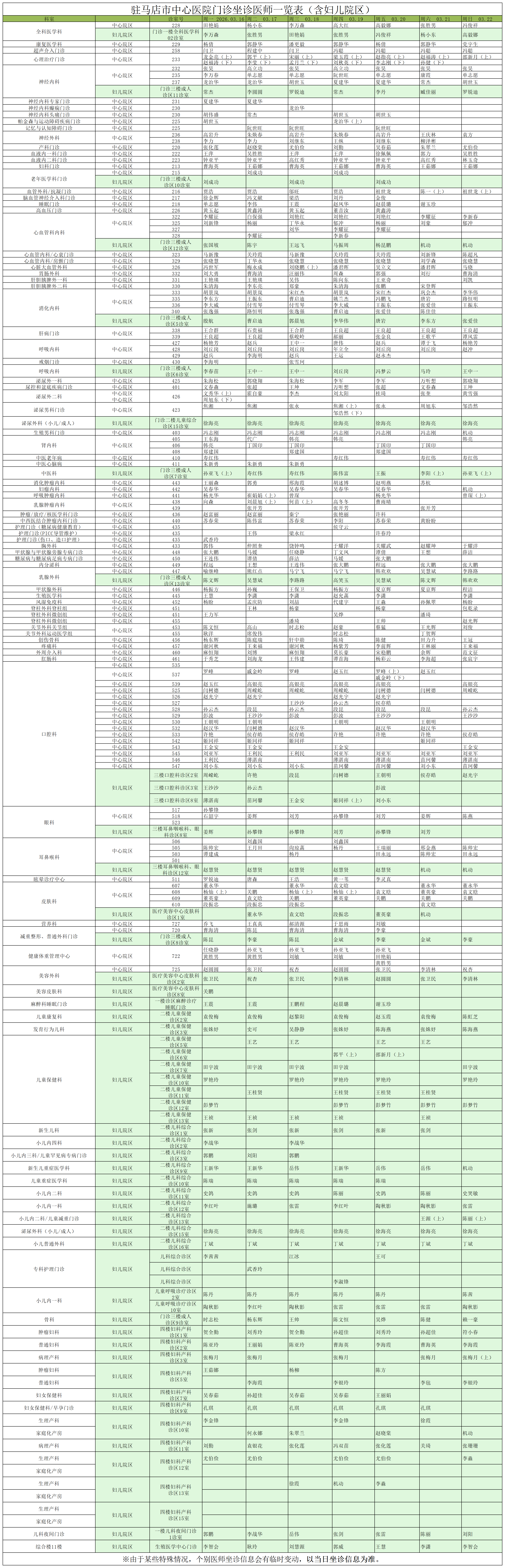 驻马店市中心医院门诊坐诊信息一览表(含妇儿院区)