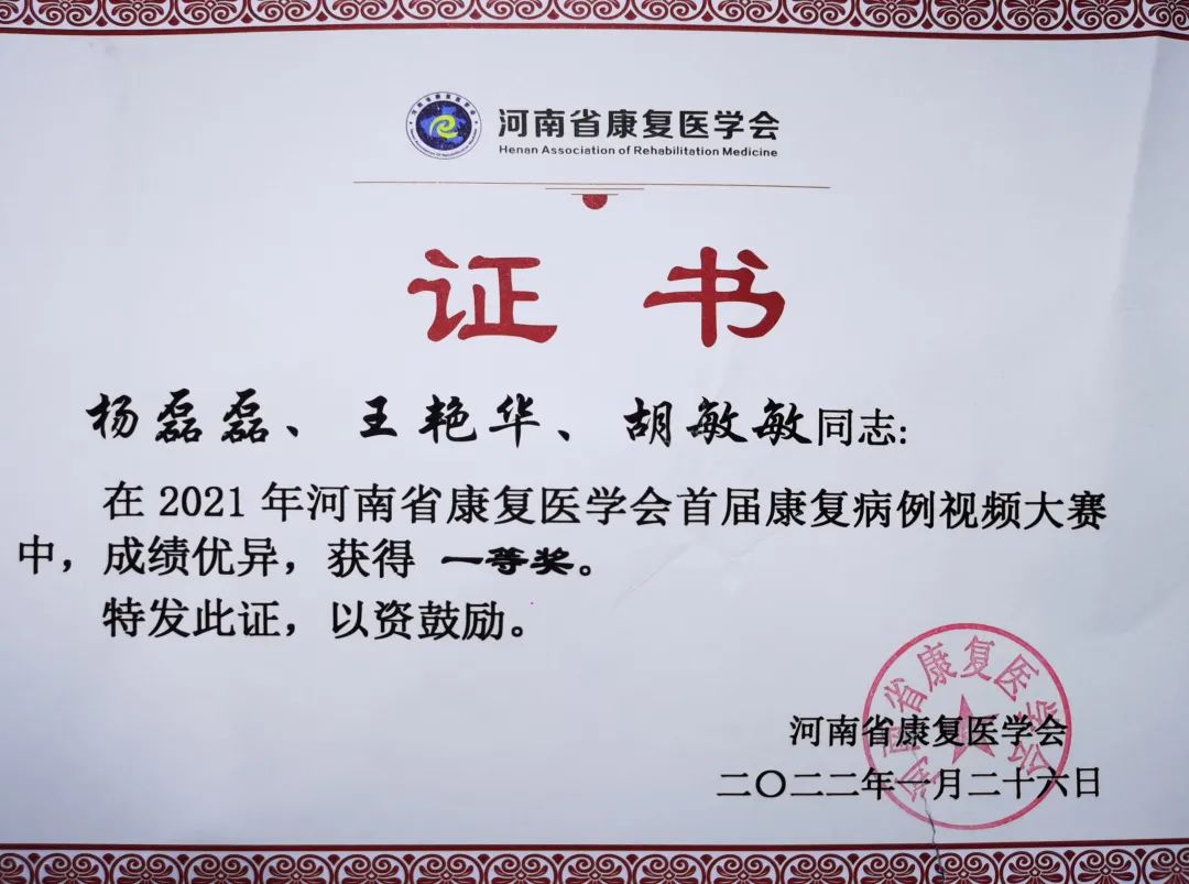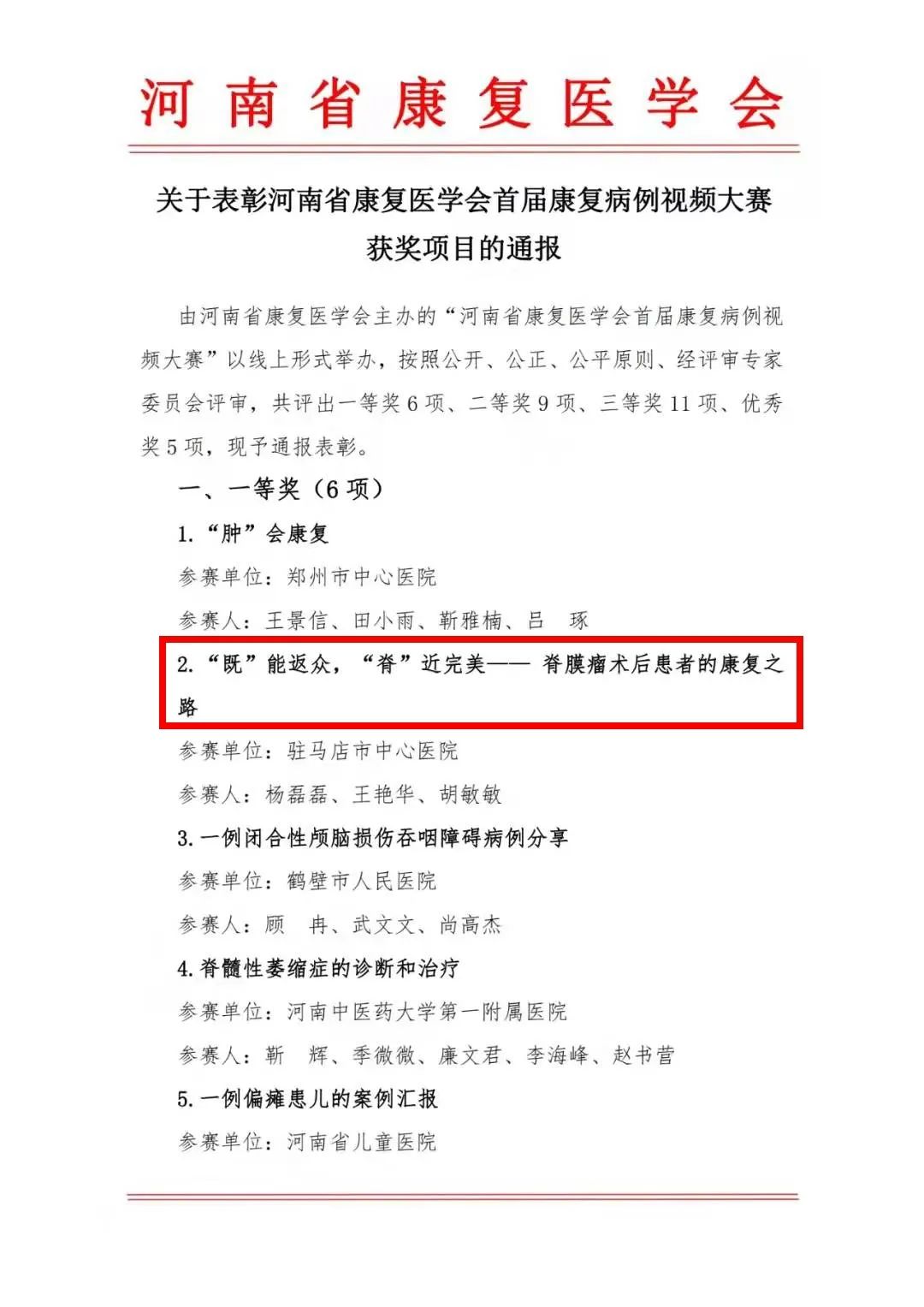 近日,河南省康复医学会首届康复病例视频大赛在线上成功举办,本次大赛共有31个医疗团队参赛,驻马店市中心医院康复医学科杨磊磊、王艳华、胡敏敏组成的团队荣获一等奖。他们的参赛题目为《“既”能返众,“脊”近完美---脊膜瘤术后患者的康复之路》。