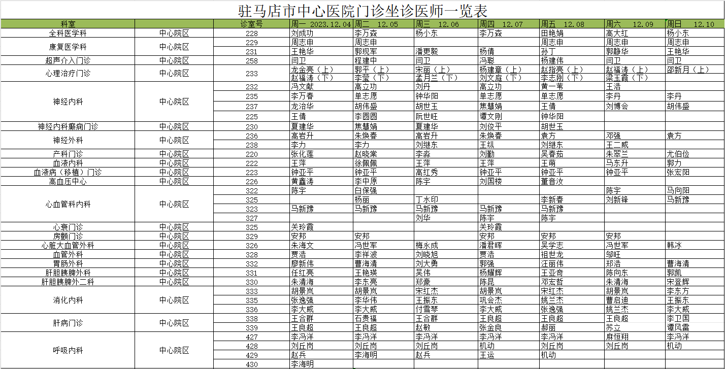 驻马店市中心医院门诊坐诊信息一览表(含妇儿院区)