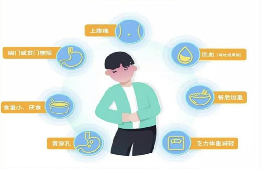 早期胃癌患者常无特异的症状,随着病情的进展可出现 类似胃炎、溃疡病的症状,主要有: ①上腹饱胀不适或隐痛,以饭后为重;②食欲减退、嗳气、反酸、恶心、呕吐、 黑便等。