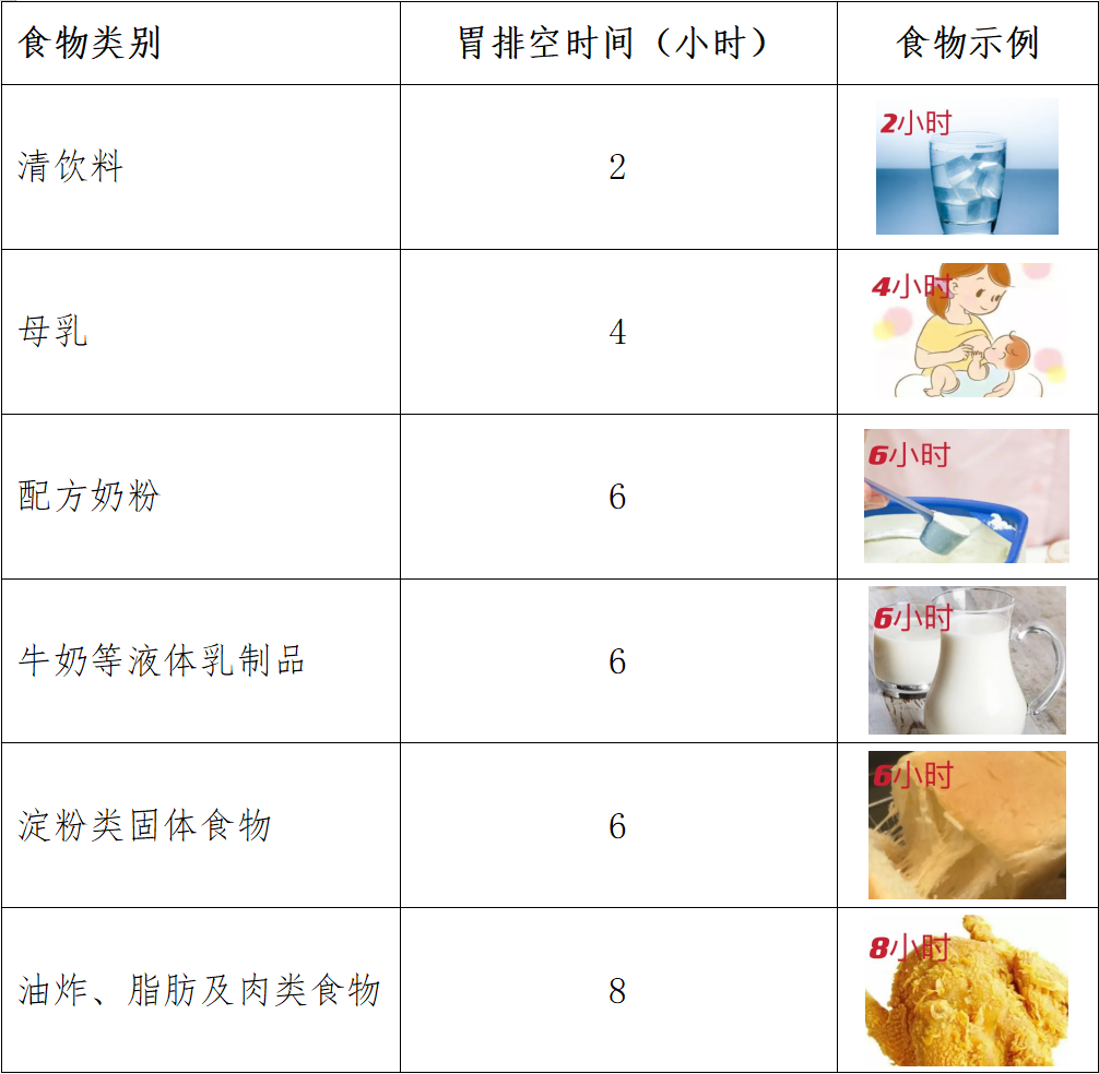 在麻醉状态下,咳嗽和吞反射被抑制,食道括约肌会变得松驰,如果胃内有食物或水就特别容易返流到口咽部,有可能误吸入肺部,一旦误吸入肺部是十分危险的!手术前禁食禁水是为了排空胃内容物,以下为大家展示部分类别食物在胃内排空时间: