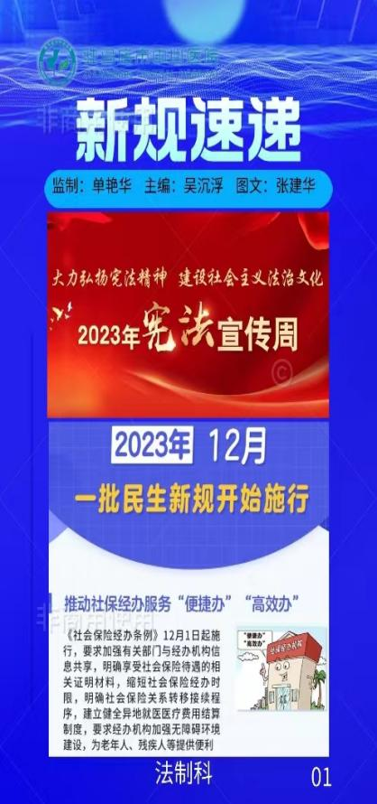 组织开展“送法进医院”活动,在医院网站上“新规速递”12期栏目,开设专栏,推动宪法和法律法规走入医院、走入日常生活走入人民群众。