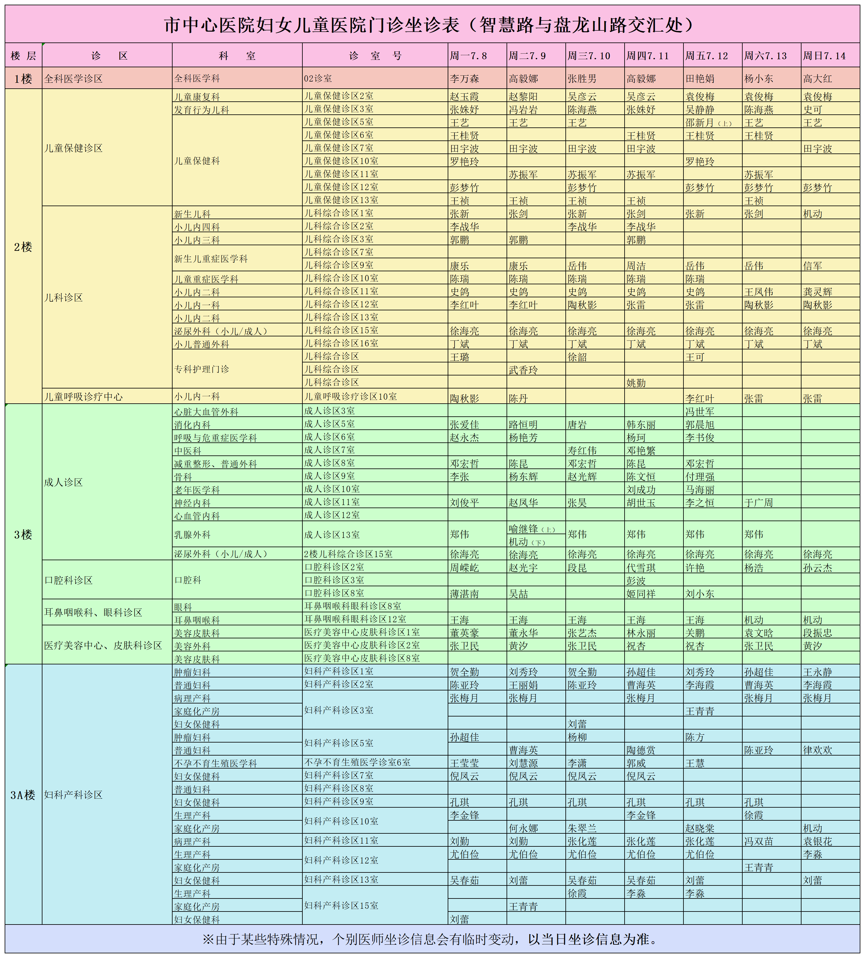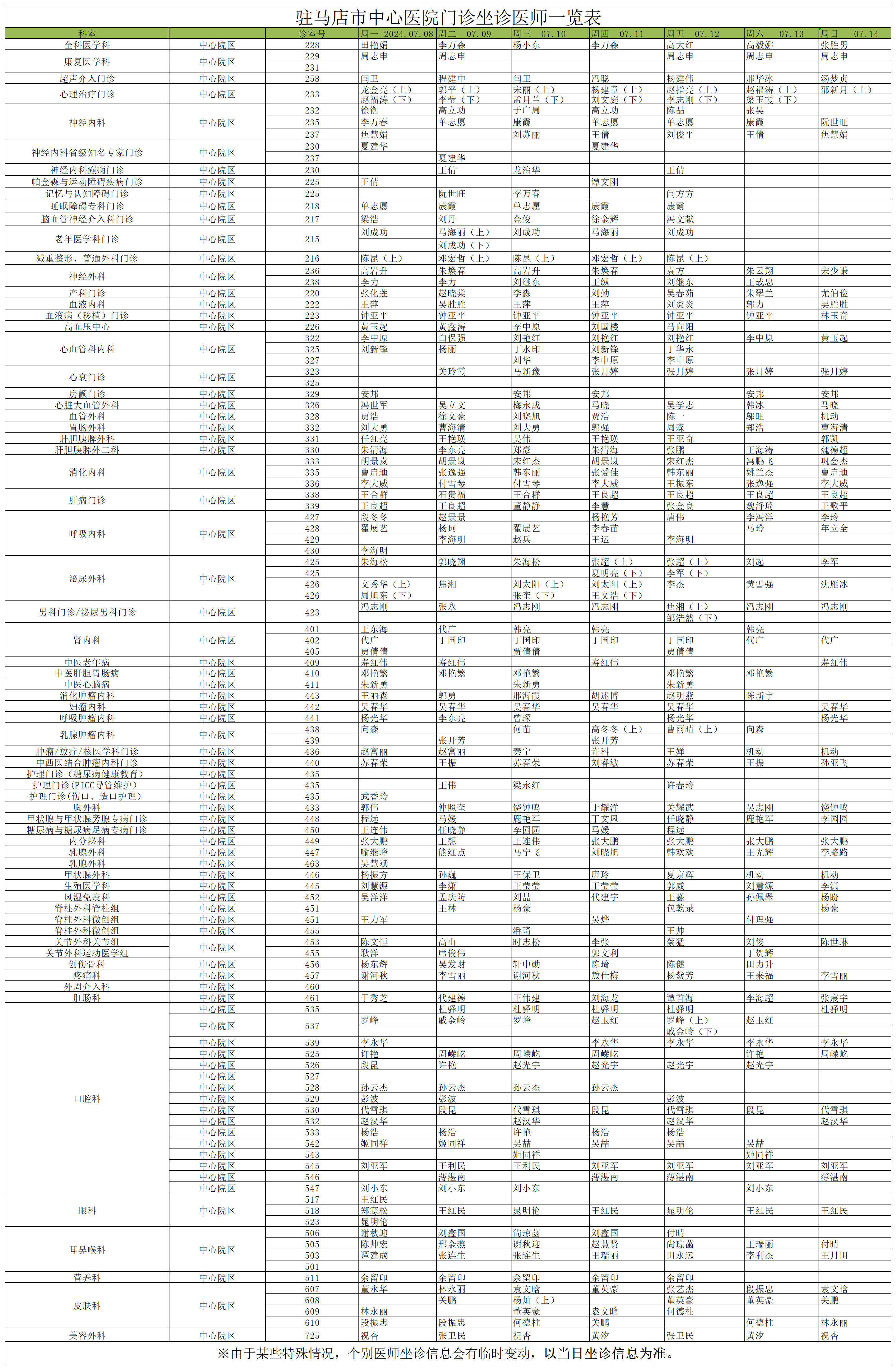 驻马店市中心医院门诊坐诊信息一览表(含妇儿院区)