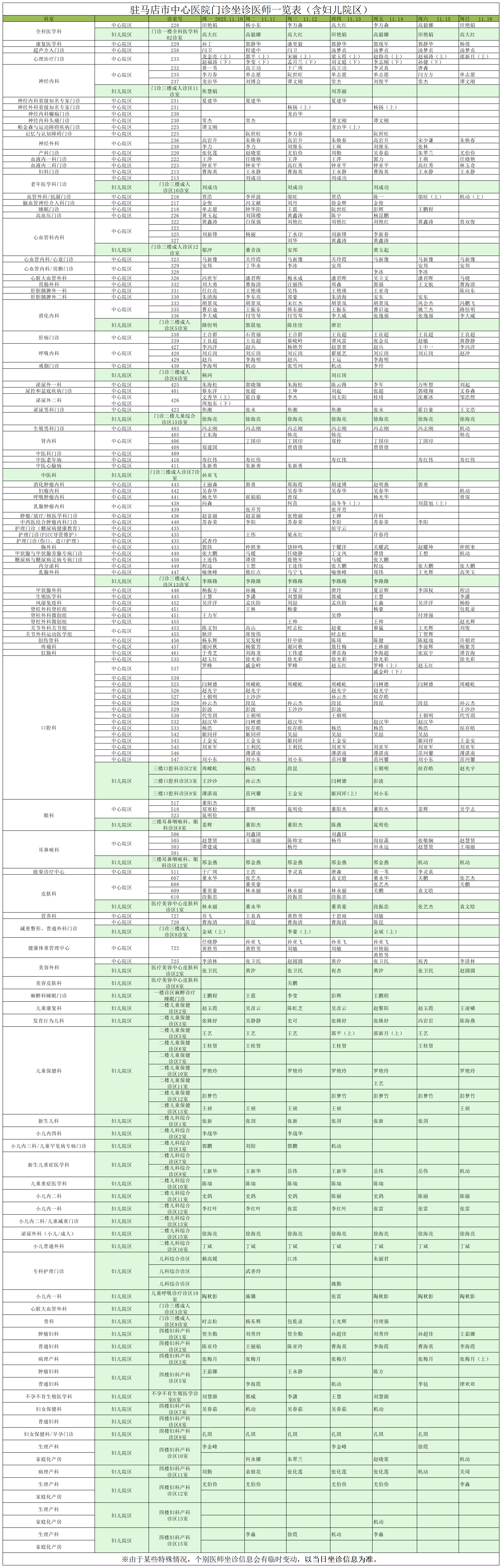 驻马店市中心医院门诊坐诊信息一览表(含妇儿院区)